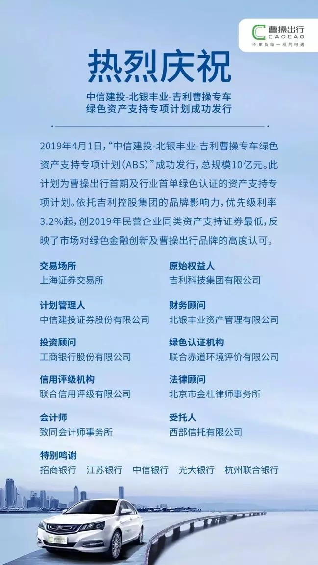 2019年4月1日,“中信建投-北銀豐業(yè)-吉利曹操專車綠色資產(chǎn)支持專項計劃(ABS)”成功發(fā)行,總規(guī)模10億元。此計劃為天堂硅谷投資項目曹操出行首期及行業(yè)首單綠色認證的資產(chǎn)支持專項計劃。依托吉利控股集團的品牌影響力,優(yōu)先級利率3.2%起,創(chuàng)2019年民營企業(yè)同類資產(chǎn)支持證券最低,反映了市場對綠色金融創(chuàng)新及曹操出行品牌的高度認可。