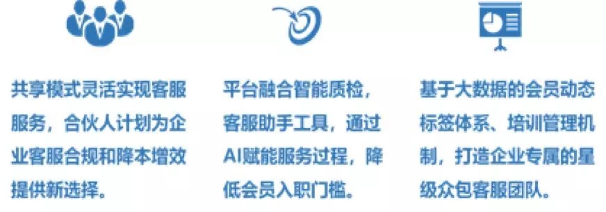平臺具備眾包運營、云端平臺、質(zhì)量管控、培訓(xùn)認(rèn)證、精準(zhǔn)營銷、智能客服六大功能要素。通過AI賦能共享,實現(xiàn)市場人力資源與企業(yè)客服需求的高低峰匹配。